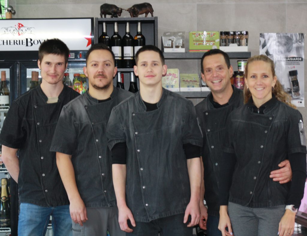L’équipe La team Boucherie Bovier Stive Bovier, patron de l’entreprise Sabrina Bovier, femme à Stive et employée à temps partiel Benjamin Diaz, employé à 100% Hervé Cosandey, employé à 80% Patrice Bressoud, employé à temps partiel et enseignant pour les apprentis bouchers au CFP Samuel Clivaz, apprenti en 1ère année